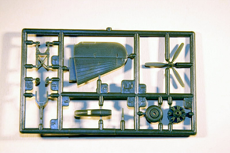 Nach DC-6 und DC-7 kann man nun also eine DC-3 von der ukrainischen Firma bauen. Der Bausatz kommt in einen unpraktischen Schüttkarton und verteilt sich auf vier Spritzrahmen in dunkelgrünen Plastik sowie einem in klarem Kunststoff. Am Ende müssen 43 Teile verbaut werden. Die Aufteilung ist in üblicher Manier, die Hinterkanten von Tragfläche und Seitenleitwerk sind zweiteilig, jedoch ist das Plastik so dünn, so dass schon Licht durchscheint. Das sollte zum akzeptablen Kanten führen.