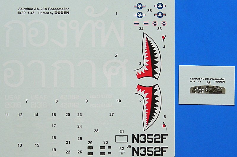 Die Abziehbilder sind von Roden und meiner bisherigen Erfahrung nach sehr störrisch. Sie erlauben die Darstellung eines olivgrünen amerikanischen Einsatz-Erprobungsflugzeugs und zweier recht bunter thailändischer Maschinen.