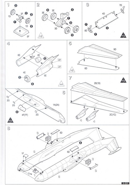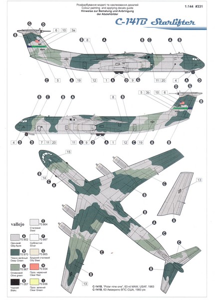 Die Positionierung der Abziehbilder wird auf der farbigen Bemalungsanleitung und in der Bauanleitung für die Stencilits gezeigt. Die Bemalungsanleitung bezieht sich auf das Programm von vallejo ohne Angabe von FS Tönen. Meiner Meinung nach sind die Farben zu hell. Insbesondere das Grau ist zu hell, es entspricht wenn überhaupt einer Maschine mit einer extrem ausgeblichenen Lackierung. Tatsächlich handelt es bei dem Grau um 36118 Medium Gunship Gray. Die beiden Grüntöne sind FS 34092 und FS 34102. Diese Farben sind von vielen Herstellern erhältlich, auch vallejo. Die Zeitangabe von 1983 ist mit Humor zu nehmen. Das Tarnmuster passt aber dafür sehr gut.