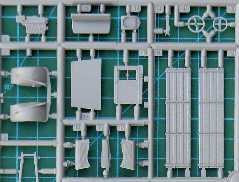 Das Modell erhält sogar einen Motor samt Lüfter, Lichtmaschine und Kühler. Weiterhin gibt es ein recht detailliertes Fahrgestell sowie ein Ersatzrad. Natürlich geht es im Fahrerhaus auch recht ordentlich weiter. So ist ein detaillierter Fahrerplatz vorhanden. Die Verglasung der Fenster soll aus einem beiliegenden Fotofilm entstehen. Das typische Fahrerhaus ist ordentlich nachgebildet.