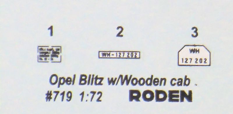 Der Decalbogen ist tadellos auf hellblauem Trägerpapier gedruckt. Leider hat man sich bei Roden beim Text in der Bemalungsanleitung vertan. Es kann natürlich kein Opel Blitz des DAK von 1942 sein! Die Farbangaben sind für das System von Vallejo.