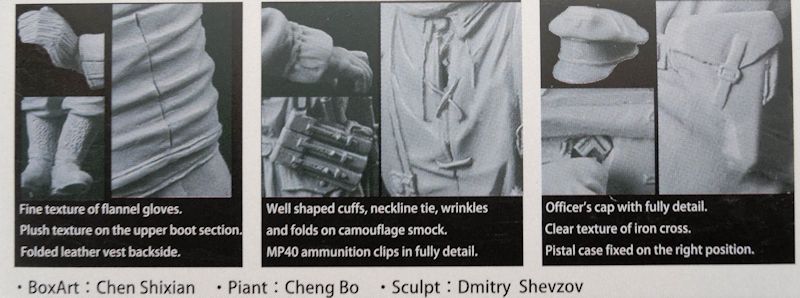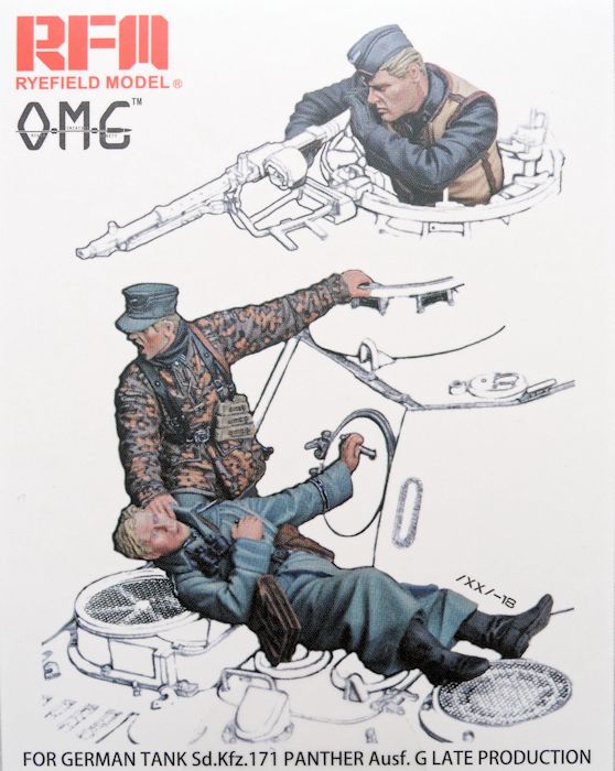 In der Packung sind drei Figuren enthalten, die für den Panther G, aus dem Haus von Ryefield, gedacht sind. Sie passen jedoch auch sehr gut zu Panther Panzern von anderen Herstellern. Die Figuren interagieren gemeinsam und stellen eine Szene dar in der ein Verwundeter durch einen Kameraden gerettet wird, während ein weiterer mit dem Turm MG des Panzers die Beiden sichert. Somit kann, sehr schön, eine kleine Action Szene auf einem Diorama dargestellt werden.