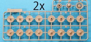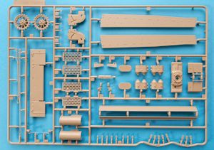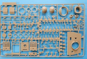 Bausatz: Wenn man den, mit einem schön gestalteten Bild, Karton öffnet wird einem erst einmal bewusst auf was man sich hier einlässt. Die mit Spritzlingen prall gefüllte Schachtel enthält absolut hochwertig gestaltete Teile die sogar in mehreren Farben gegossen sind. So sind die Aufbau- und Wannenteile in Beige, die Fahrwerks und Kettenteile Schwarz und die Innenraumteile in einem hellen Grau vorhanden. Die Winkelspiegel sowie das Aufbaudach sind in Klar gegossen. Neben zwei Ätzteilbögen, Metallkabel, Polycaps finden sich noch ein Decalbogen sowie eine Montageanleitung in Heftform.