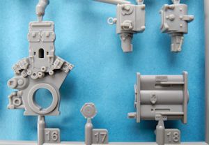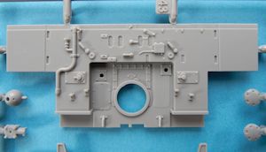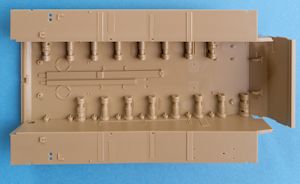 Die Inneneinrichtung dieses Panzers lässt wirklich nichts vermissen. Vom kleinsten Handrad über das Funkgerät bis zur hochdetailierten Brandschutzwand zum Motorraum ist alles vorhanden. Der 12 Zylinder Maybach Motor sowie der gesamte Antriebsstrang mit dem Getriebe ist schon ein Bausatz für sich und fast zu schade zum Einbauen, da hiervon im fertigen Modell nicht mehr viel zu sehen sein wird. Die Motorabdeckung wird in einzelnen Segmenten montiert und lässt sich somit, wie beim Original, öffnen um die Kühler sowie Tanks zeigen zu können. Die Tankstutzen und Belüftungsöffnungen sind hier als einzelne Teile ausgeführt und können so auch geöffnet gebaut werden, um z.B. eine Auftankszene darzustellen.