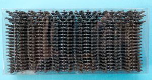 Die Kettenmontage in Baustufe 29 ist leider dermaßen aufwendig, dass sie wohl die meiste Bauzeit in Anspruch nehmen dürfte. Diese Art der Kettenfertigung wird leider heute von fast allen Herstellern favorisiert. Die Segmente der Kette werden in eine Lehre zu je vier Gliedern gelegt und mit insgesamt acht Minibolzen verbunden. Zusätzlich müssen auf jedes der Glieder noch zwei Führungszähnen aufgeklebt werden. Wenn man diese 96 Glieder pro Seite zusammengesetzt hat wird man zwar mit einer hochdetaillierten Kette sogar mit durchbrochenen Führungszähnen belohnt werden, vermutlich dann jedoch am Rande eines Nervenzusammenbruches stehen. Ich denke, dass hier viele vermutlich auf Friulketten ausweichen werden, die dann sogar noch realistisch durchhängen.