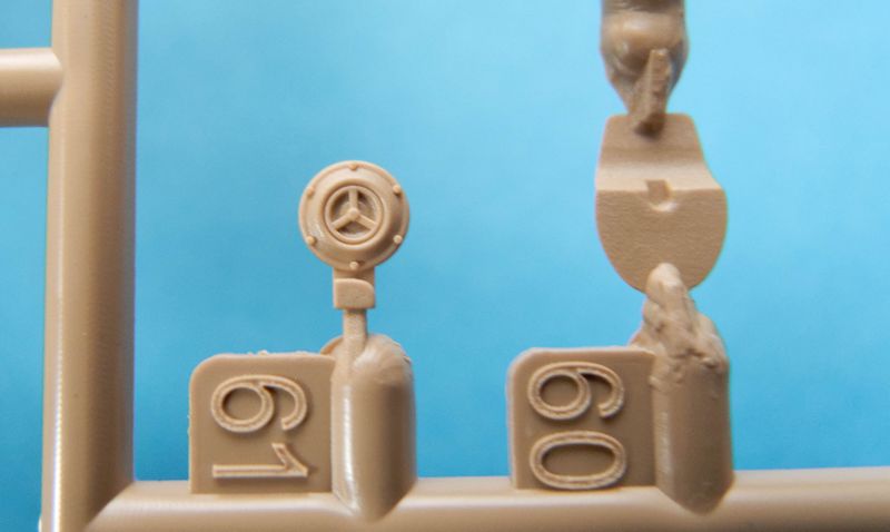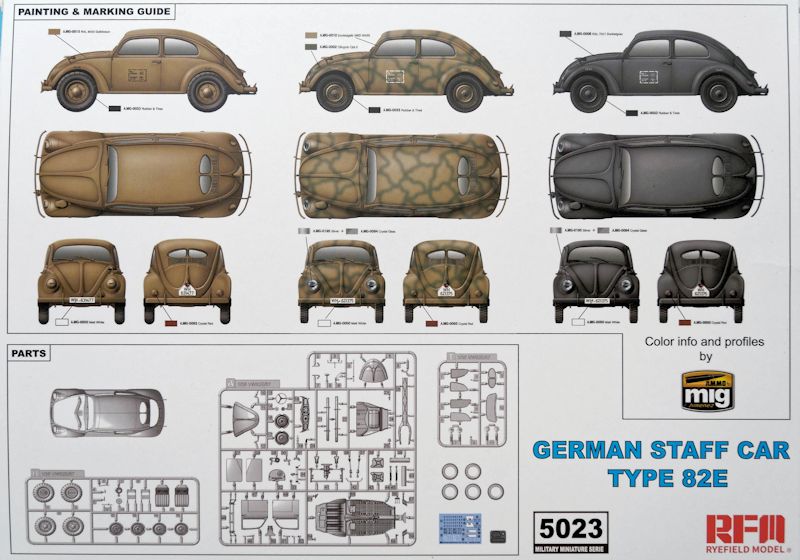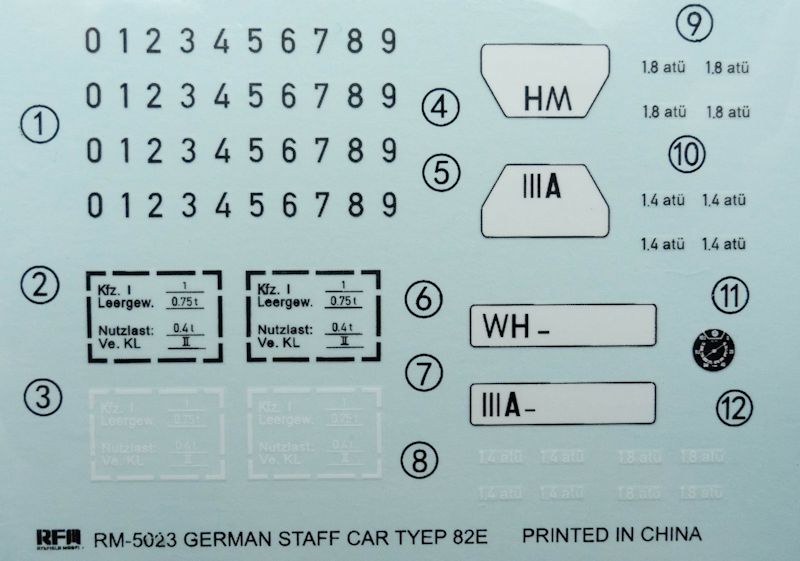 Neben einer Dunkelgelben gibt es eine in Dunkelgrau und eine in Tarnfarben. Die Farben sind einzig auf das Mig Programm bezogen. Der Decalbogen hat die Besonderheit, dass die Nummernschilder als einzelne Ziffern beiliegen und individuelle Kombinationen ermöglichen. Die Verladetafeln und Reifendruckangaben sind sowohl in Schwarz als auch in Weiß vorhanden.