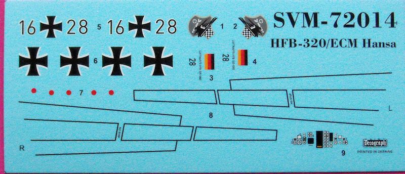 Auf einem kleinen, auf hellblauem Trägerpapier gedruckten Blatt befinden sich die wenigen Abziehbilder. Neben den Instrumenten für das Armaturenbrett sind das die Hoheitszeichen, die taktische Nummer, das Staffelsymbol und die Walkways für die Tragflächen, aber keine Stencils. Der Druck sieht sehr gut und scharf aus.