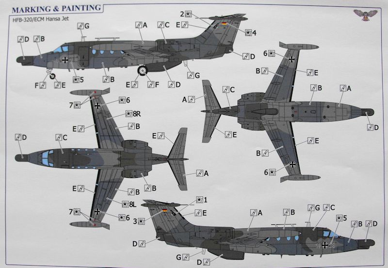 Bauanleitung/ Bemalung: Die erste Seite der Bauanleitung enthält unter anderem einen kurzen Abriss der Entstehungsgeschichte des Hansa Jet und eine Aufzählung der Humbrol-Farbtöne. Die zweite Seite stellt den Schachtelinhalt vor und zeigt auch, welche Teile für die zu bauende Version benötigt werden. Auf den verbleibenden Seiten ist dann der Bau des Modells in elf Schritten dargestellt. Als besonders Bonbon ist auf jedem einzelnen Abschnitt die Nummern der zu verbauenden Teile aufgeführt. Die Bauskizzen sind groß und sehr eindeutig, jegliches Rätselraten entfällt.