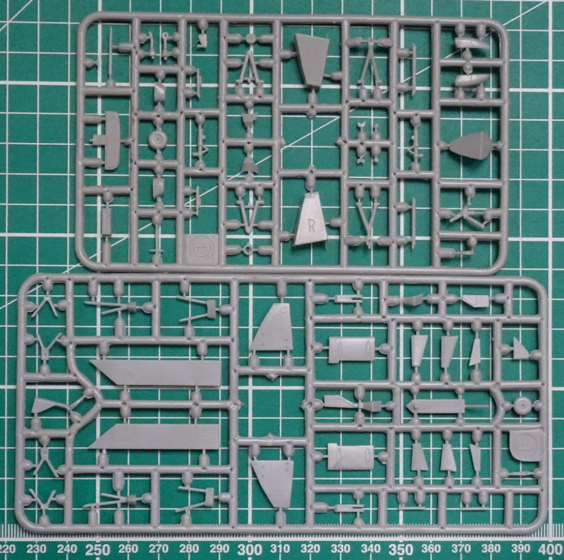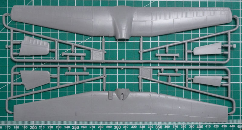 Bei der Montage des Motors muss man aufpassen, dass man nicht aus Versehen die Teile für den ersten Prototypen verbaut. Dann sollte man sich ein Vorbildfoto besorgen, damit man entscheiden kann ob das Flugzeug mit geschlossener Verkleidung oder ohne flog. Bei letzterer Option gibt es einen Sternmotor der aus zwei Hälften zusammengesetzt wird. Die Tragfläche fügt man aus Ober- und Unterseite zusammen. Der kleine Lufteinlauf wird danach noch ergänzt.
