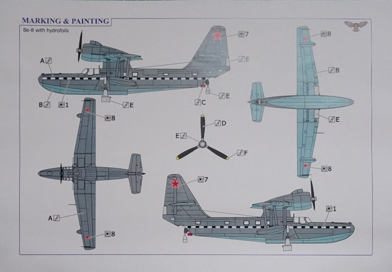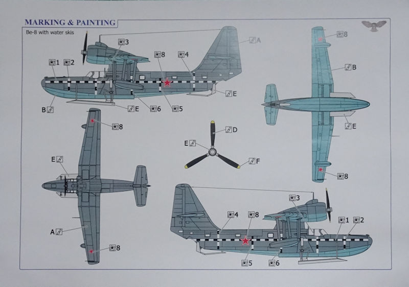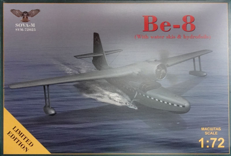 Bausatz: Die Berijew Be-8 ist als Original nicht ein großer Erfolg gewesen und so ist es nicht erstaunlich, dass kein Spritzgussbausatz von diesem Typ existierte. So hat SOVA-M eine Lücke erkannt und brachte in 1/72 zwei verschiedene Bausätze heraus. Der eine beinhaltet die normale Amphibienvariante und dieser hier hat die ZAGI-Modifikationen von 1955 mit dabei. So befinden sich in diesen Bausatz sechs graue Spritzgussrahmen mit 138 Teilen, ein klarer Spritzling mit 14 Teilen, elf Fotoätzteile, ein Decalbogen, zwei mehrfarbige Bemalungsanleitungen und die Bauanleitung.