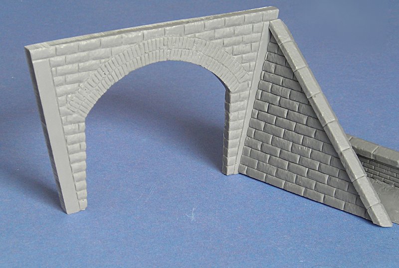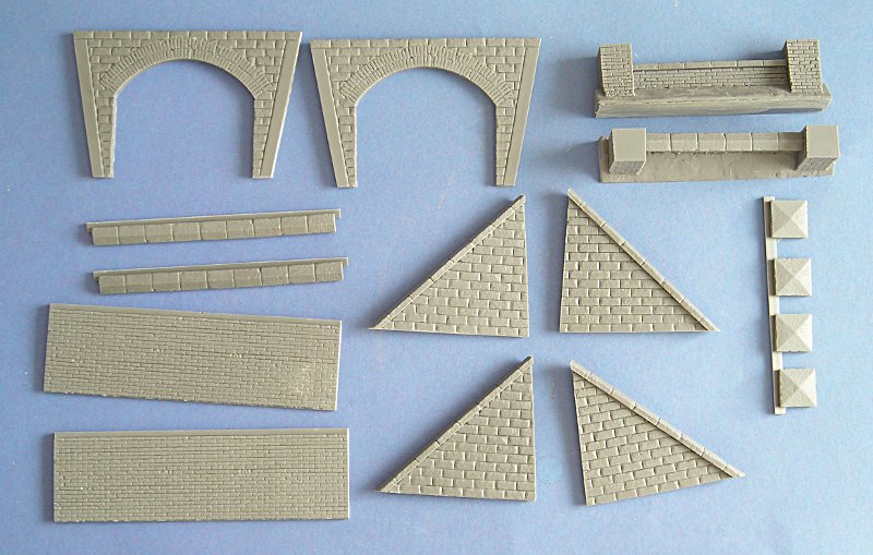 Zunächst überrascht, dass der gut gepolsterten Versandkarton eine Metallbox mit dem Bausatz enthält. Dieser vermittelt eine hohe Wertigkeit des Produktes (zu recht) und entspricht garnicht dem sonst oft üblichen Plastebeutel - oder "Schlimmeres". Dann enttäuscht etwas, das die Schienen nicht dabei sind, aber das wusste ich wegen des Berichtes auch schon vor dem Kauf und daher war es kein wirkliches Manko. Das graue Material ist sehr stabil und hat fast keine Gußblasen - bei denen, die ich gefunden habe, bin ich nicht mal sicher, ob diese nicht Teil das abbröckelnden Mauerwerkes sind. Die Teile sind bereits grob von ihren Angüssen befreit und bedürfen daher nur geringer Nacharbeit... ganz ohne geht es aber nicht.