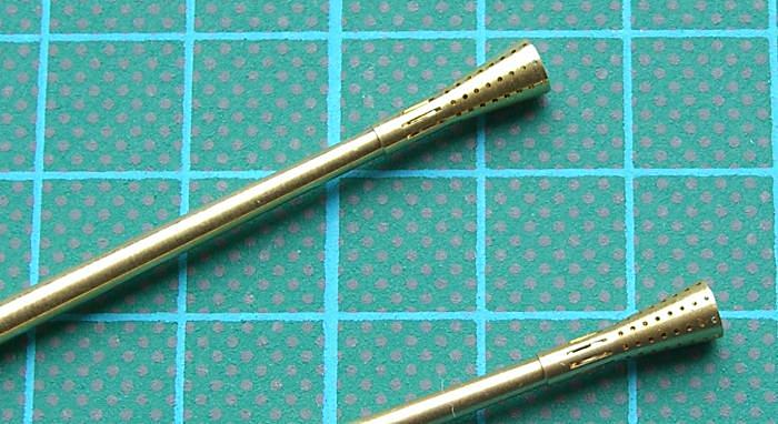 Robert Schatton ist manchmal sehr schnell mit seinen Zubehörsets fertig. Für den neuen 1:32er Stuka von Hasegawa hat er gleich seine 37 mm Flak-Rohre aus Messing herausgebracht. Die Rohre sind eine Schau, denn nicht nur die Mündung ist hohl, sondern sie hat auch Schlitze und Bohrungen an den Seiten. Sie ersetzen direkt die Bausatzteile.