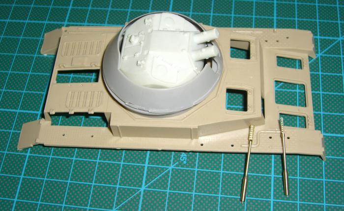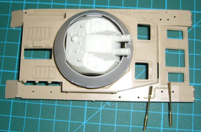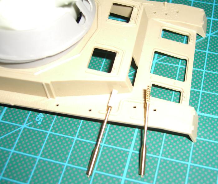 Bausatz: Robert Schatton hat wieder für die Freunde des 48er Maßstabs ein interessanten Umausatz entwickelt. Dieser besteht aus Turmdrehkranz, innere Turm-Kugel, und äussere dünne schräge Zusatzpanzerung. Es liegt ein Metallstift als Achse zur Höhenverstellung bei. Ebenso sind die 3 cm MK 103 Rohre in Messing hohl gedreht. Alle 7 seitlichen Röhrchen sind hohl und durchbrochen.