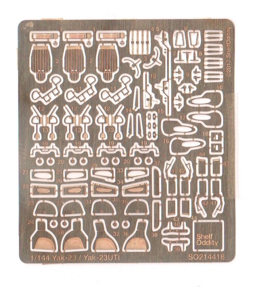Vor rund 1 ½ Jahren ist von Mikro Mir die Jak-23(First Look hier) als Neuheit auf den Markt gekommen. Nun ist dafür ein Fotoätzteileset von Shelf Oddity erschienen, welches genug Teile für die beiden Modelle in der Box vorhält. Auf der 4 cm x 4,5 cm großen Platine sind über 50 Teile untergebracht, was auf dem ersten Blick erschreckend wirkt wegen der teilweise sehr geringen Größe der Teile. Nun gut, wir sind im Maßstab 1/144 unterwegs. Grundsätzlich werden alle Bereiche aufgewertet, sprich z.B. also das Cockpit mit neuen Sitzen, Seitenkonsolen und Gurten.