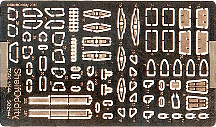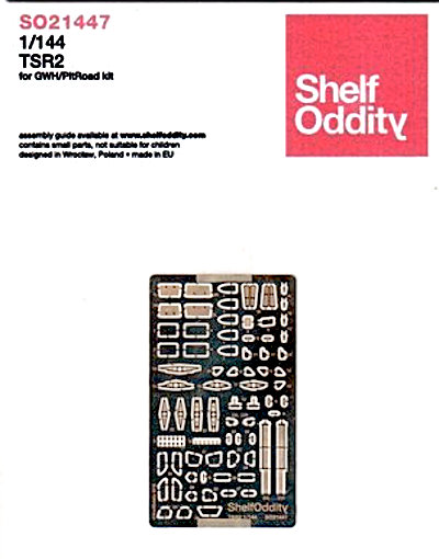 Für die vor über zwei Jahren erschienene BAC TSR.2 von GWH bzw. Pit Road hat sich bisher keiner der bekannten Hersteller mit einem Zurüstsatz aus Fotoätzteilen beschäftigt. Eine Lücke, die man bei der relativ jungen Firma Shelf Oddity aus dem polnischen Wroclaw(Breslau) erkannt hat und mit dem vorliegenden Set schließt. In einem wiederverschließbaren Folienbeutel kommt die ca. 4,5cm mal 2,5cm große Platine aus Messing zum Käufer. Die darauf enthalten über 40 Teile beschäftigen sich nur mit dem Äußeren der Maschine. Der Cockpitbereich ist bei geschlossenen Hauben eh nicht wirklicg gut einsehrbar, Des Weiteren verweist man auch ganz selbstlos auf das Resinset von Retrokit, welches den Bereich bei Bedarf aufwertet.