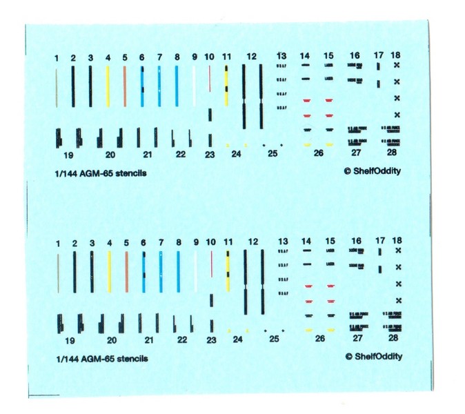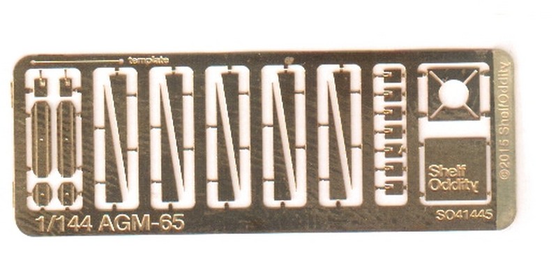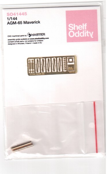 Modell: Neben Abziehbildern und Fotoätzteilen bietet die noch junge Firma Shelf Oddity auch einige Zurüstsets von Raketen in 1/144 an. Aus dieser Serie stelle ich hier das Set der AGM-65 Maverick vor. In einem wiederverschließbaren Foliebeutel kommt dieses zum Käufer und enthält zwei aus Messing gedrehte Raketenkörper, eine 4cm x 1,5cm große Platine mit Fotoätzteilen sowie einen Abziehbilderbogen mit den ganzen Stencilits. Die beiden Drehteile, welche von der für Ihre gedrehten Kanonenrohre und Pitotrohre bereits bekannten Firma Master hergestellt wurden. Die Qualität ist einfach toll, der Körper ist perfekt rund und maßhaltig. Am hinteren Ende ist der Raketenmotor sehr fein dargestellt, ein Bereich, der bei den, den Bausätzen beiliegen Interpretation der Originale oft gar nicht vorhanden ist, und das nicht nur bei den 1/144er! Die Spitze ist massiv gehalten und deckt damit alle Varianten der AGM-65 ab.