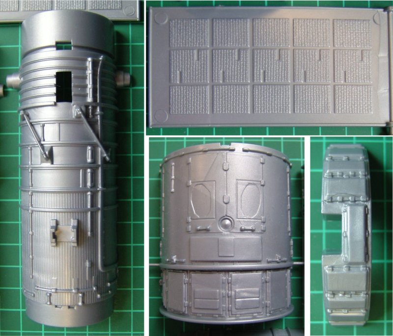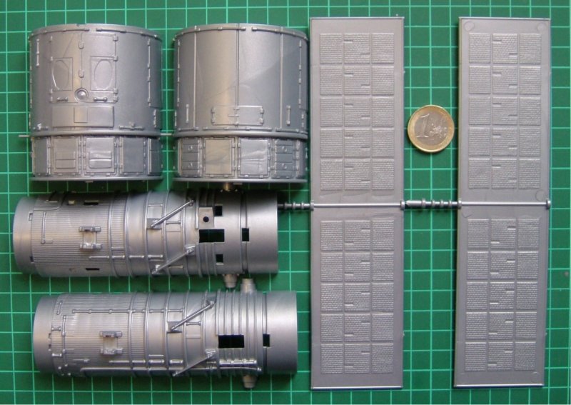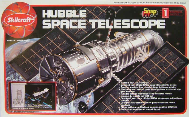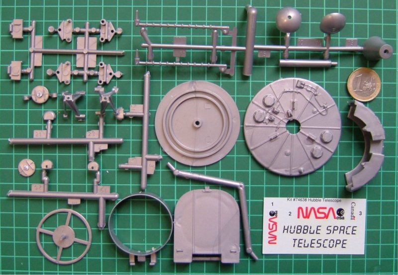 Der Snap-Kit stammt aus dem Jahr 1995 und besteht aus 34 Einzelteilen. Mit ca. 20 cm Länge und fast 7 cm Durchmesser hat das fertige Modell schon eine ordentliche Größe. Die diversen Details der Einzelteile sind sehr überzeugend. Die Abdeckklappe kann beweglich montiert werden. Der kleine Markierungsbogen enthält u.a. NASA-Schriftzüge sowie eine Beschriftung für den zweiteiligen Displayständer. Einziges Manko des Bausatzes sind die etwas einfach gestalteten Solar-Flügel. Hier kann der Real-Space-Modellbauer bei Bedarf noch "supern".