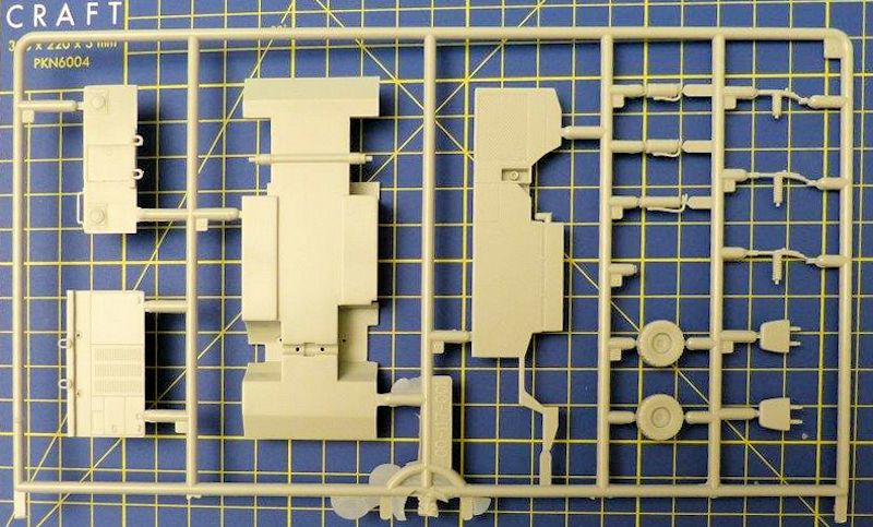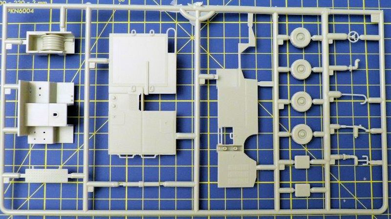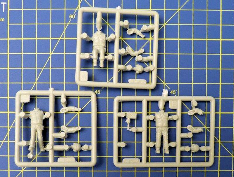 Der mittelgroße Schüttkarton mit dem Deckelbild des gebauten Modells, enthält zwei größere hellgraue Spritzlinge mit einer überschaubaren Anzahl von Bauteilen. Die etwas schlichte Detaillierung des Modells ist ausreichend. An drei kleineren Spritzrahmen befinden sich die Figuren des Deckpersonals. Die Darstellung der Deckskleidung hat SKUNKWORK gut umgesetzt. Die Kleidungsstücke weisen einen interessanten Faltenwurf auf.