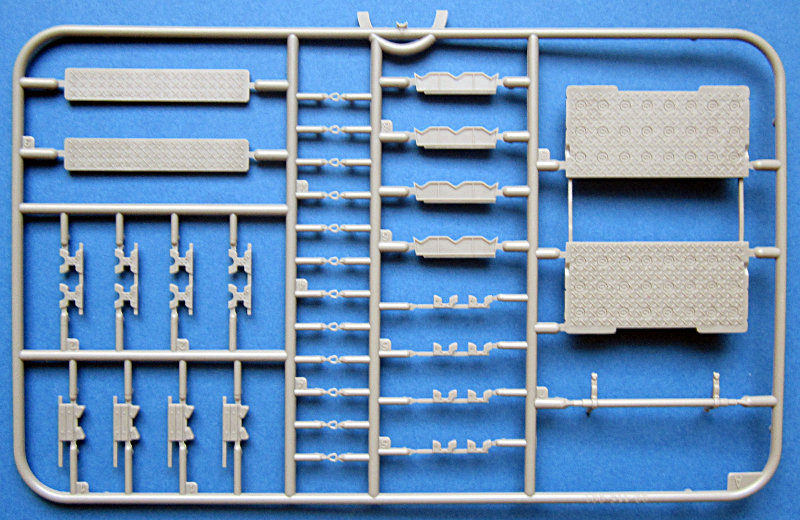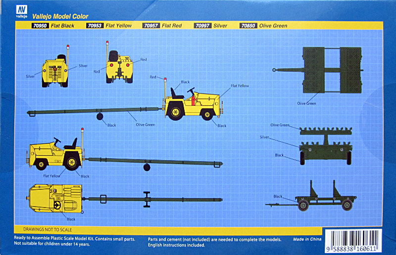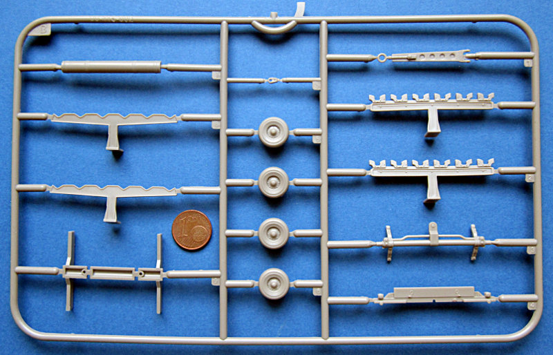 Außerdem enthält der Karton einen amerikanischen Anhänger zum Transport von Raketen. Das Hauptbauteil ist bei meinem Kit etwas verzogen, aber vielleicht richtet sich das noch beim Anbau des Fahrwerks. Das Missile Cart kann in verschiedenen Ausführungen gebaut werden, je nachdem, welche Waffen auf dem Wagen transportiert werden. Die Kartonrückseite zeigt einen Bemalungsvorschlag. Decals fehlen diesmal.