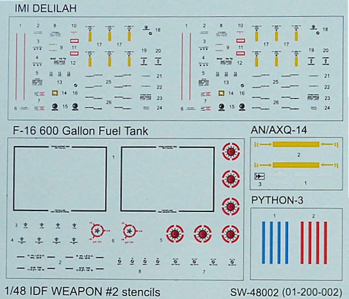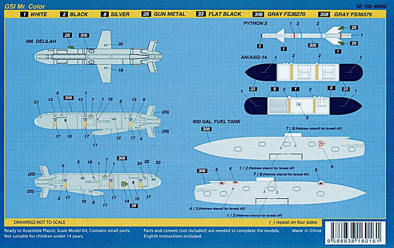 Dieser Satz enthält deutlich weniger Material als der erste Waffensatz. Von den Tanks braucht man sicher nur 2 aber von den Python 3 hätten es ruhig ein paar mehr sein können. Bewaffnungs- bzw. Ausrüstungsvorschläge für verschiedene Flugzeugtypen gibt es nicht. Es liegt auch eine kleine Bauanleitung bei, so dass beim Zusammenbau eigentlich nichts schief gehen sollte. Die Abspritzung der Teile entspricht dem heutigen Niveau. Die Gravuren sind vielleicht nicht ganz so fein wie bei Tamiya, aber in Ordnung.