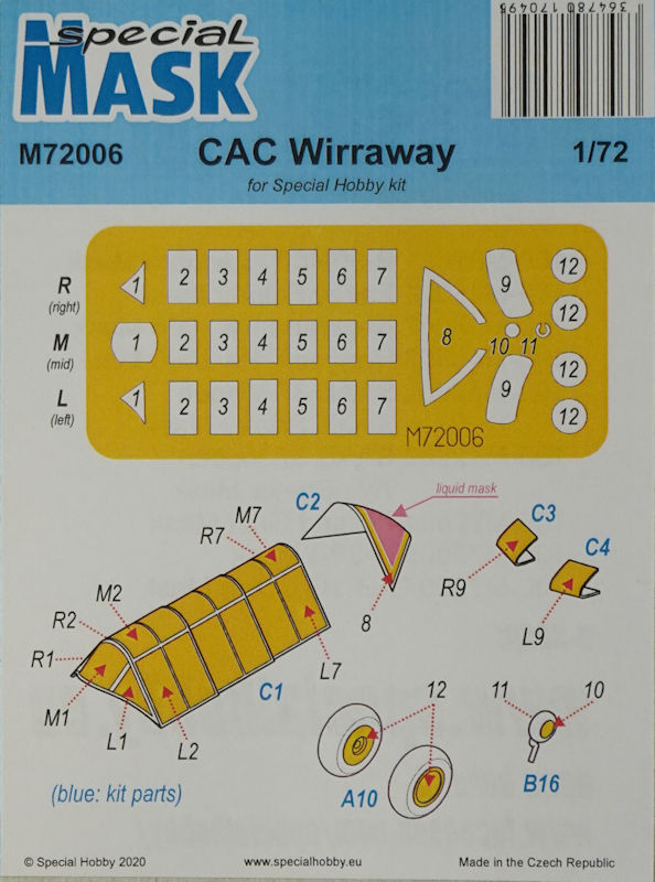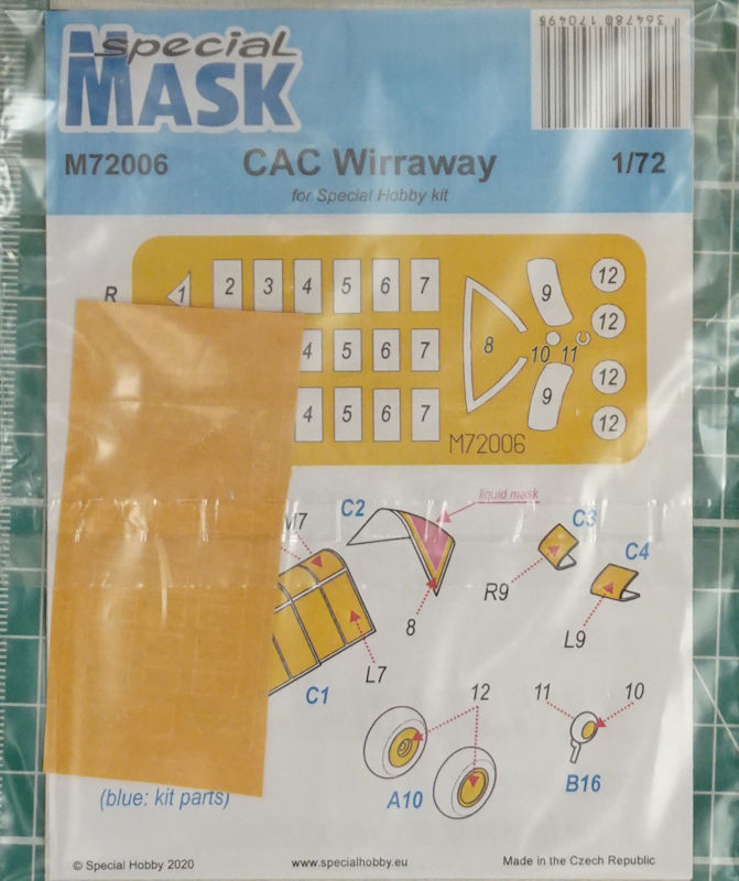 Für den hauseigenen CAC Wirraway in 1/72 hat special hobby ein Maskenset herausgebracht. Diese Maskenset enthält einen gelben Bogen für die Kanzel, die Scheinwerfer in der Tragfläche und die Fahrwerksräder des Bausatzes.