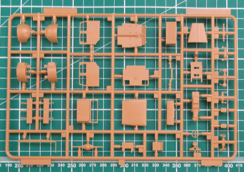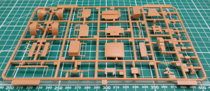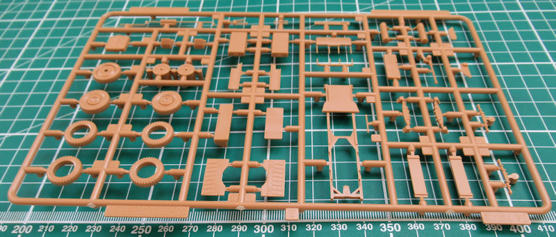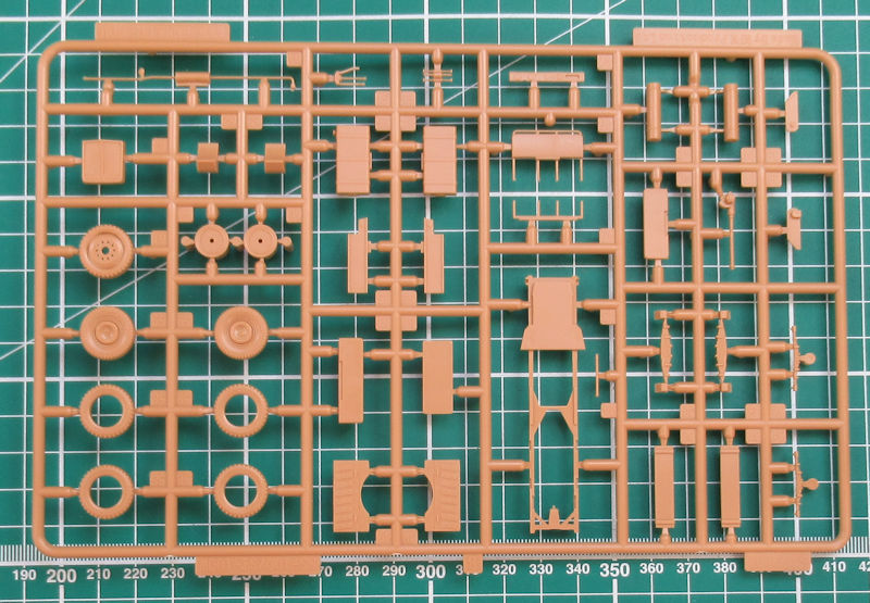 Die Spritzgussteile sind voll auf der Höhe der Zeit. Man hat die Auswerferpins so platziert, dass sie nicht stören. Der Bau beginnt hier mit dem Fahrwerk. Es gibt natürlich schön detaillierte Blattfedern, die Unterseite von Motor und Getriebe sowie die Kardanwelle. Dann folgt die Montage von Achsen und Auspuffanlage. Die Kotflügel hat man einzeln anzubauen. Drei Räder bestehen aus einem Stück und beide Hinterräder werden aus zwei Teilen zusammengefügt.