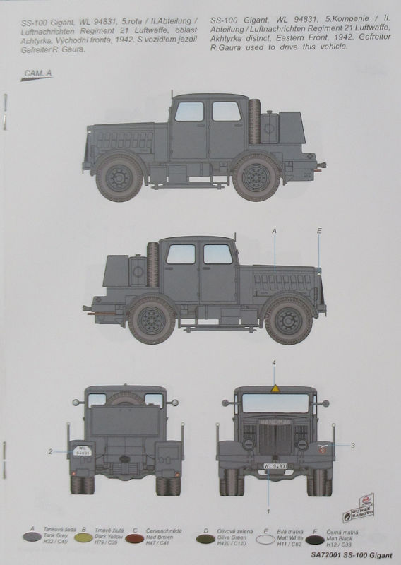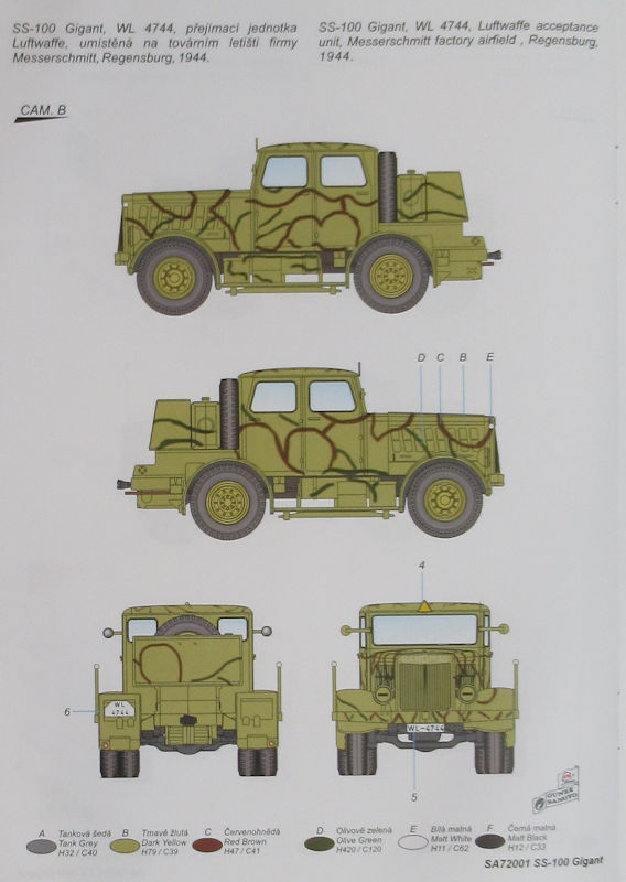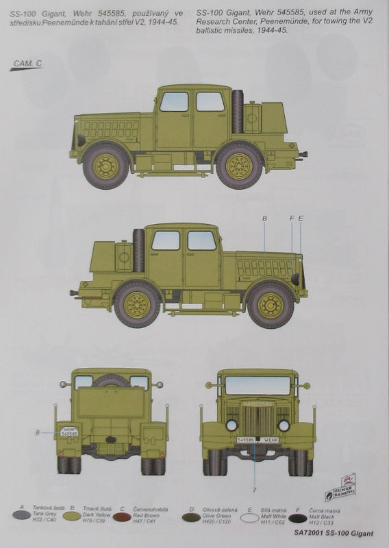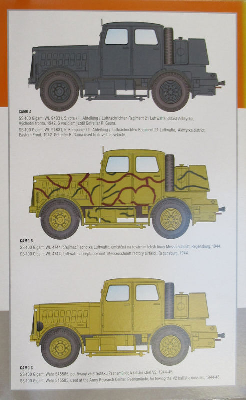 Bausatz:Unter dem Label special ARMOUR erschien dieser Bausatz 2013 als passende Zugmaschine für die haueigenen Bausätze der V2 und deren Transportanhänger im Maßstab 1/72. In der attraktiven aber unpraktischen Schüttbox befinden sich zwei hellbraunen Spritzlinge mit 96 Teilen, ein klarer Spritzlinge mit acht Teilen, ein kleiner Decalbogen und die mehrfarbige Bau- und Bemalungsanleitung.