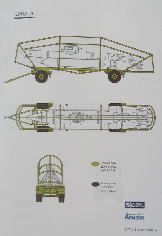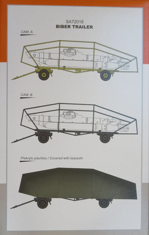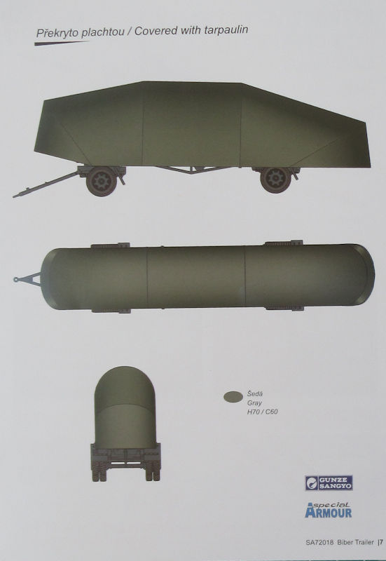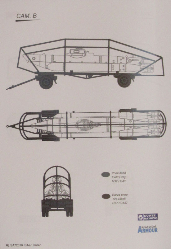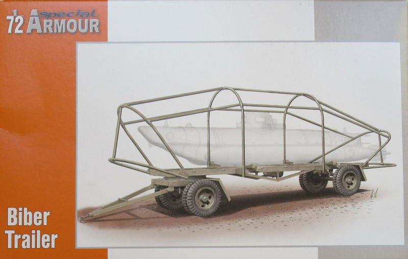 Bausatz: Ein passenden Transportanhänger für das Kleinkampfmittel Biber im Maßstab 1/72 erschien unter dem Label special ARMOUR. In der attraktiven aber unpraktischen Schüttbox befinden sich gut verpackt ein grauer Spritzling mit 57 Teilen, ein Ersatzteil, ein Papierbogen und die mehrfarbige Bau- und Bemalungsleitung.