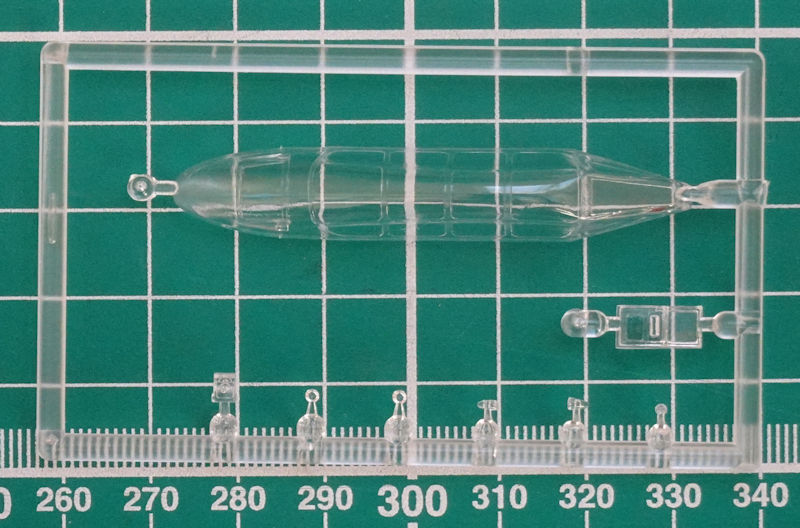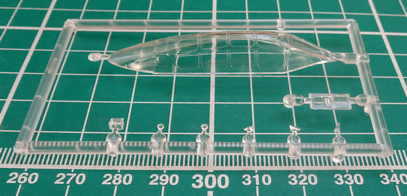 Die zwei Hälften des Höhenleitwerks bestehen jeweils aus einem Stück. Dadurch gibt es scharfe Hinterkanten. Sehr gelungen finde ich die komplex abgespritzten Fahrwerksteile. Trotz einiger Zusammenfassungen wirken sie nicht einfach. Die Klappe für das Bugrad hat auch die beiden Scheinwerfer aus Klarsichtmaterial. Es finden sich im Kit auch alle drei Zusatztanks. Leider ist die Cockpithaube einteilig. Eine Antenne muss aus Draht selbst gefertigt werden.