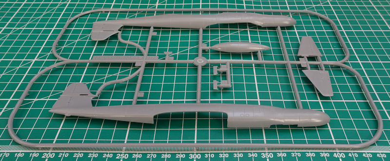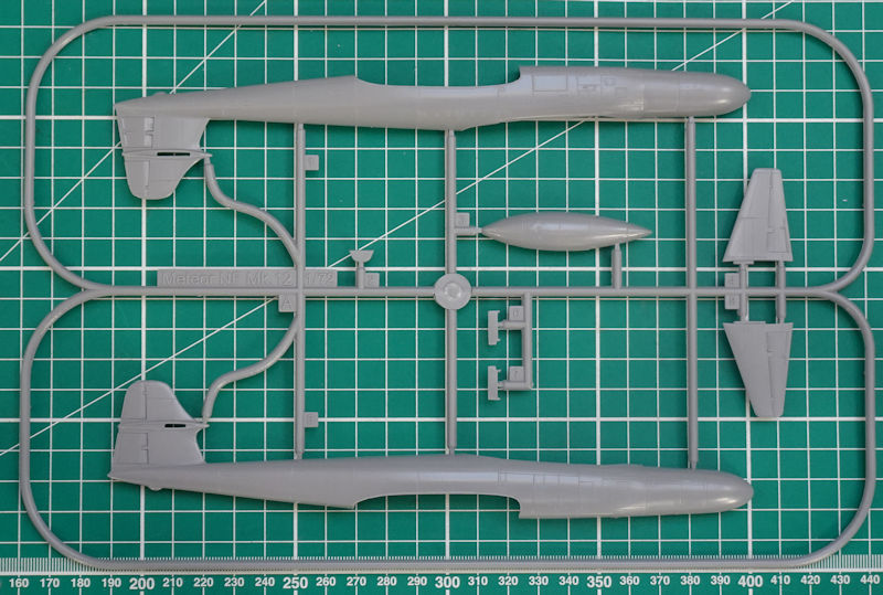 Die beiden Rumpfhälften müssen hier nicht gestückelt werden. Für jede Variante gibt es einen neuen Spritzling. Ein Gegengewicht im Bug ist nicht vorgesehen aber ich würde trotzdem eine Kleinigkeit in der Spitze unterbringen. Die Triebwerksteile sehen auch nach zwei Derwent-Turbinen aus. Scharfe Hinterkanten gibt es leider bei der Tragfläche nicht aber sie besteht im wesentlichen aus zwei Großbauteilen. Für die Luftein- und -auslässe gibt es jeweils einen einteiligen Ring. Sehr gut!