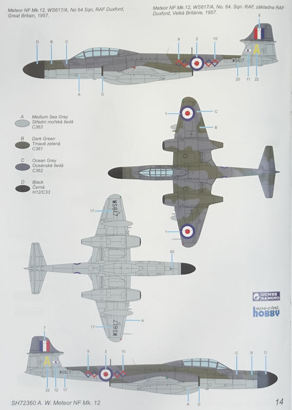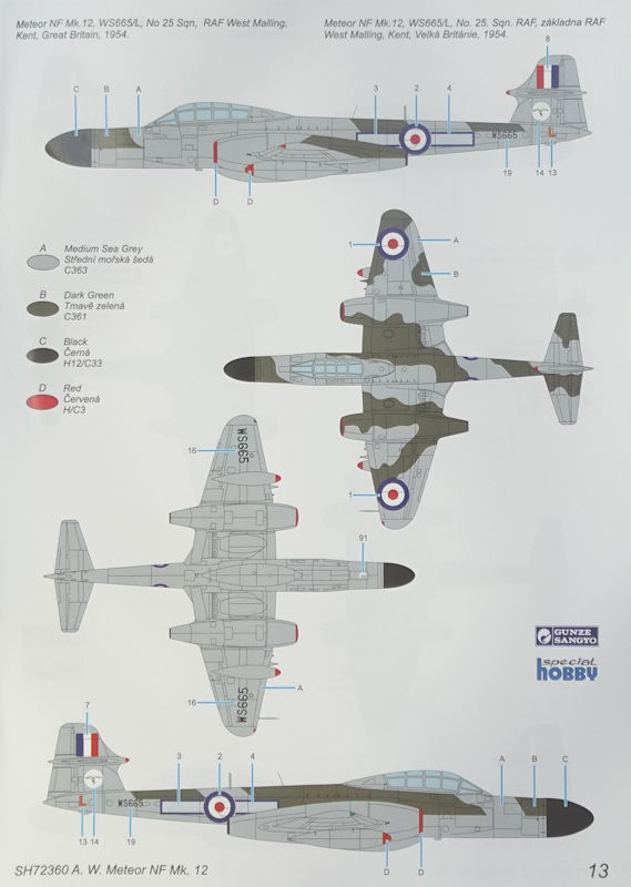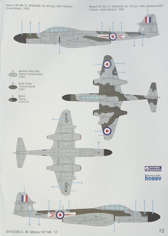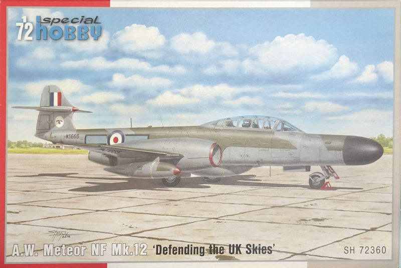 Bausatz: Schon etwas länger hatte man auf die späten Meteor-Varianten in 1/72 bei special hobby gewartet. Zuvor gab es nur den älteren Matchbox-Bausatz der auch von XtraKit noch mal aufgelegt wurde. Nun ist die erste Variante NF. Mk. 12 auf dem Markt und meine Freude ist groß. So befinden sich in dem attraktiven praktischen Stülpkarton fünf graue Spritzlinge mit 144 Teilen, ein Klarsichtrahmen mit acht Teilen, zwei Decalbögen und die mehrfarbige Bau- und Bemalungsanleitung.
