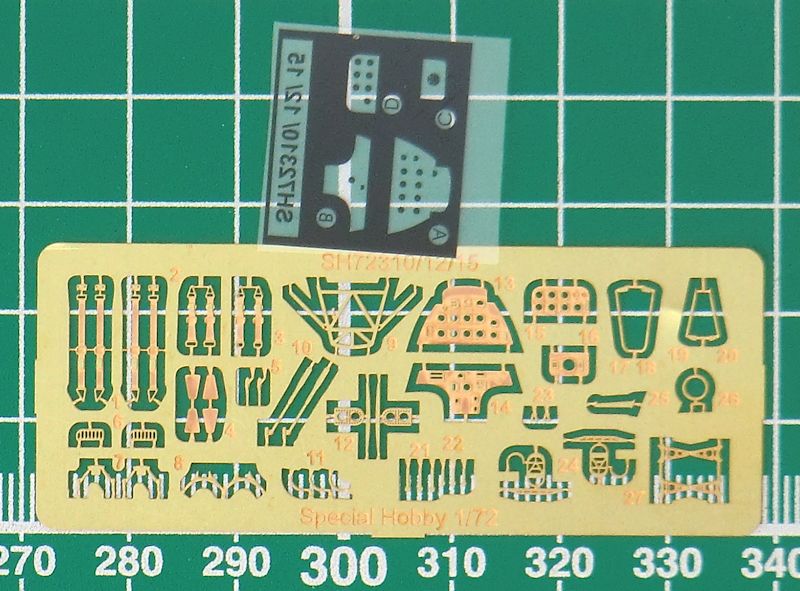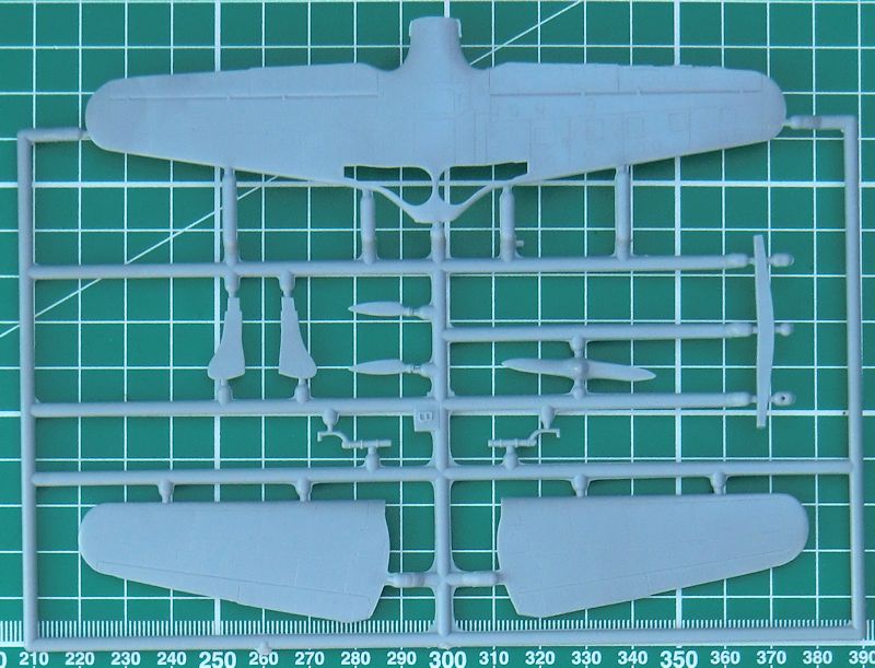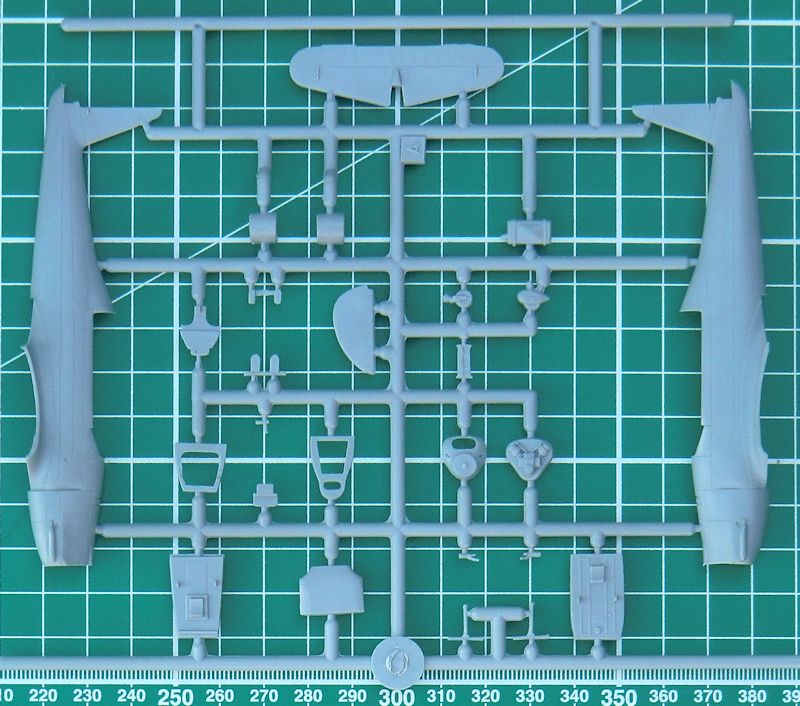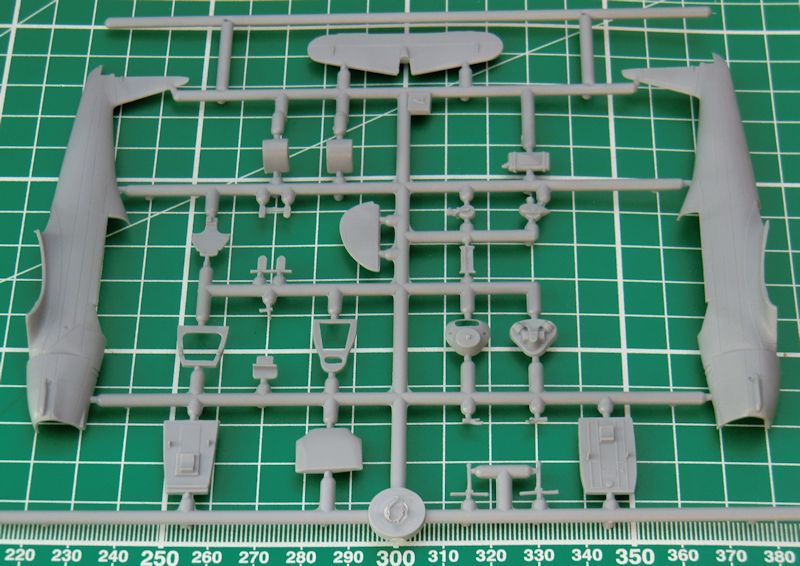 Die Spritzgussteile entsprechen fast denen der Ar 96B und besitzen feine versenkte Strukturen. Man hat insbesondere eine neue frühe einteilige Luftschraube hinzugefügt. Auch innen im Rumpf hat man sich bei special hobby richtig Mühe gegeben. Im Cockpit gibt es fotogeätzte Instrumentenbretter die mit einem Fotofilm hinterlegt werden. Alternativ kann man geätzte Seitenruderpedale einbauen. Die Sitzgurte gibt es als Fotoätzteile. Die Klarsichtkanzel besteht leider nur aus einem Stück.