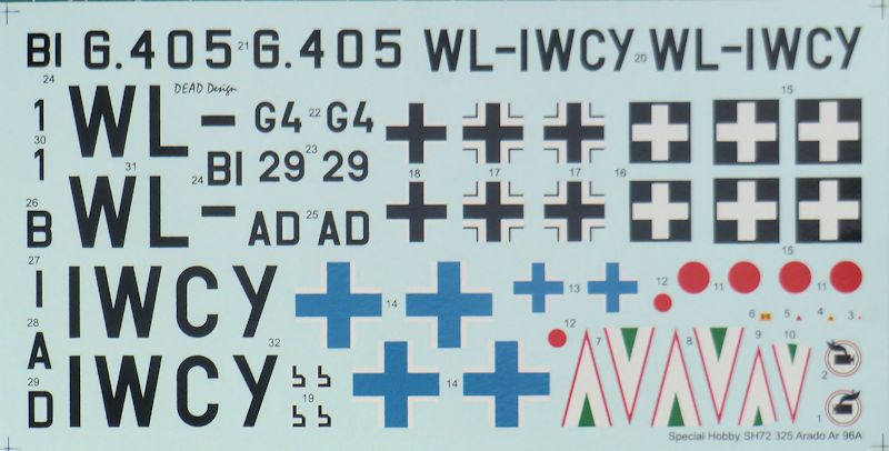 Die mehrfarbigen Bemalungshinweise sind sehr gelungen. Special hobby liefert hier die RLM-Farbtöne und die für das Gunze-Farbsystem. Der große Decalbogen ist bei DEAD Design erstellt und tadellos auf blauem Trägerpapier gedruckt worden.