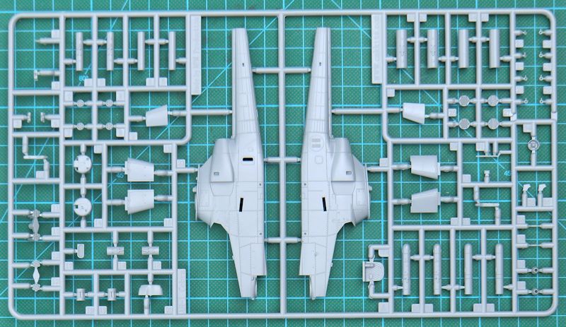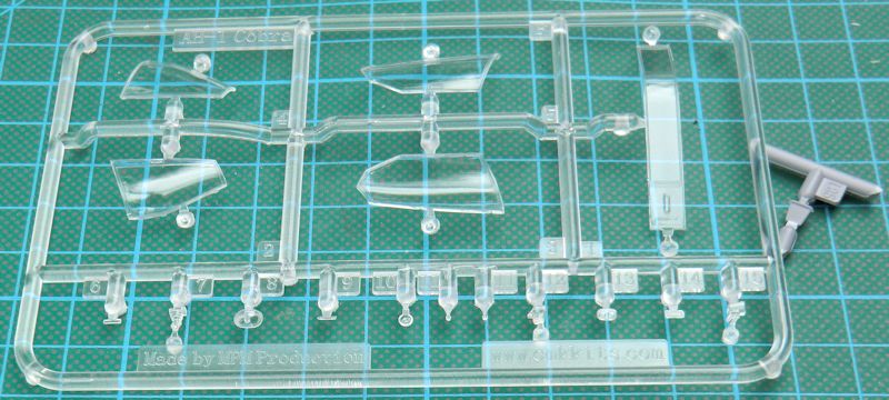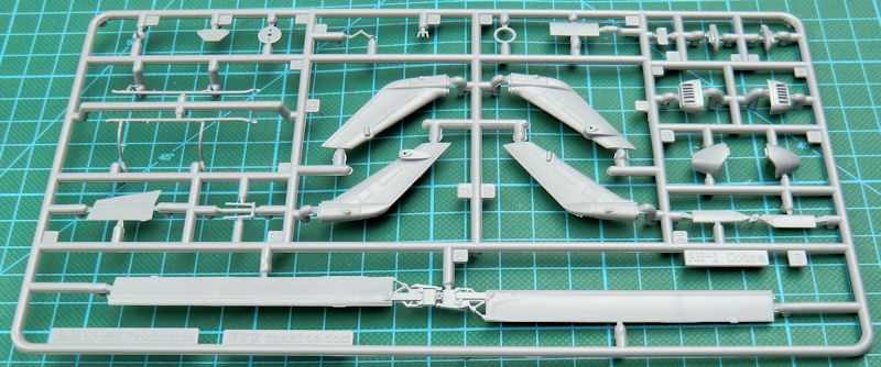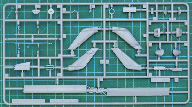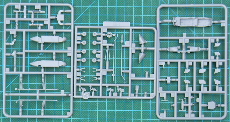 In dem recht großen attraktiven Stülpkarton befinden sich gut verpackt fünf hellgraue Spritzlinge mit insgesamt 143(!) Teilen, einen Klarsichtrahmen mit sechszehn Einzelteilen, zwei Decalbögen und die mehrfarbige Bau- und Bemalungsanleitung. Die Teile haben feinste Strukturen und besitzen durchaus fernöstliches Niveau. So gibt es sehr feine Kleinteile. Ein paar Spritzgussteile wandern in die Restekiste, denn sie sind für andere Varianten bestimmt. So gibt es beide Heckausleger und verschiedene Kufen.