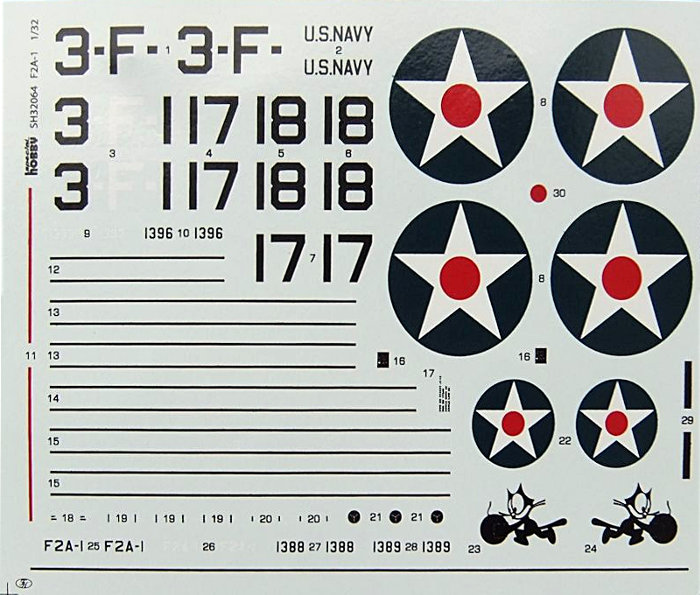 Bemalung: Special Hobby bietet insgesamt drei unterschiedlich gekennzeichnete Maschinen der Saratoga an. Als vierten Vorschlag gibt es dann noch die Buffalo einer Schuleinheit aus NAS Norfolk, ganz in Neutralgrau über alles. Der Anstrich, der auch für unser Modell vorgesehen ist, war der damalige Neutralitätsanstrich amerikanischer Trägerflugzeuge. (Das U.S. Army Air Corps hatte übrigens ähnliche Bemalungen.) Vor allem die auffälligen gelben Tragflächen symbolisierten die Neutralität, waren aber gleichzeitig auch ein Sichtschutz im umgekehrten Sinn gegenüber einer Tarnfarbe. Bei einer Notwasserung war das Flugzeug leichter durch Seenoteinheiten zu lokalisieren. Bei der Figur an den Rumpfseiten handelt es sich um "Felix the Cat", eine damals in Amerika populäre Comicfigur. Nach dem Krieg gab es die Comics unter dem Namen: "Felix der Kater" auch in Deutschland.