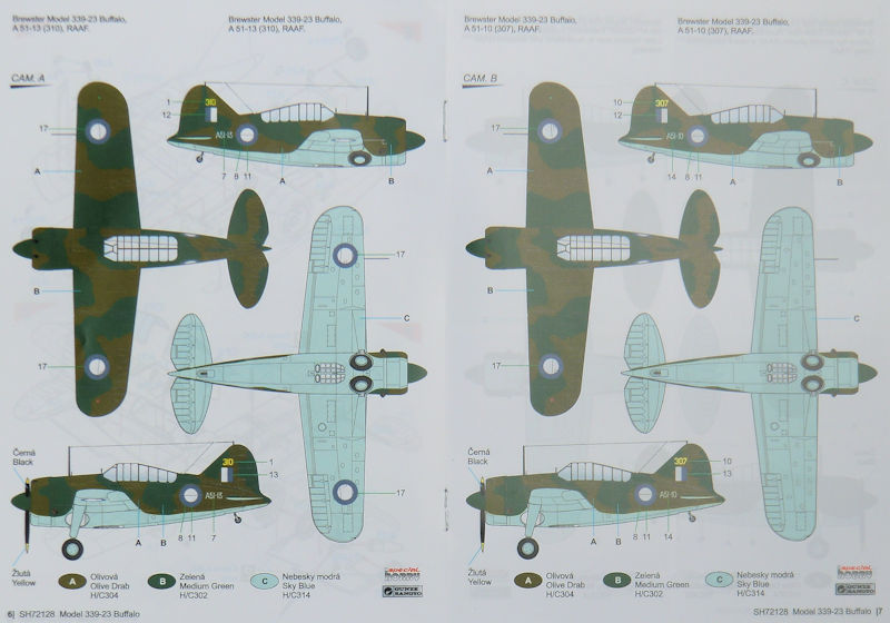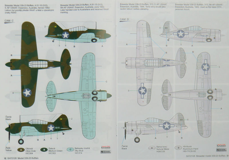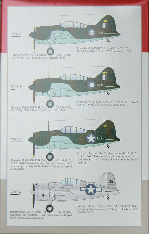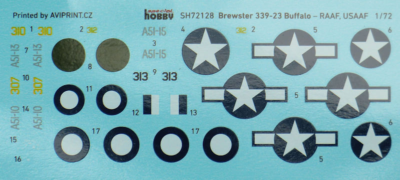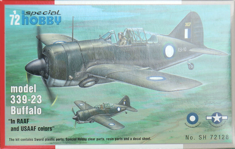 Bausatz: Hasegawa hatte sich vor ca. 20 Jahren schon mal mit der F2A-1 und deren Ableger beschäftigt. Leider wurde der Bausatz, so ganz im Gegensatz zur gängigen Praxis des Herstellers, nicht so richtig ausgeschlachtet. Egal, vor ca. zehn Jahren brachte special hobby den ersten Bausatz der 72er Buffalo heraus. Zuvor hatte man für Classic Airframes einen 1/48 Bausatz produziert. Nun brachte special hobby einen Bausatz der Brewster model 339-23 in heraus. In einer attraktiven aber unpraktischen Schüttbox befinden sich gut verpackt ein hellgrauer Spritzgussrahmen mit 49 Spritzgussteilen, ein klarer Rahmen mit zehn Teilen, 15 Resinteile, ein Decalbogen und die mehrfarbige Bau- und Bemalungsanleitung.