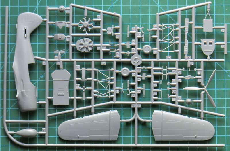 Innen gibt es ein solides Cockpit. Hier fehlen nur noch die Sitzgurte. Weiterhin gibt es strukturierte Innenseiten und ein Rohrgerüst. Der Motor entsteht aus vier Teilen. Leider ist die Cockpitverglasung nur aus einem Stück. Zum Glück sind die hinteren Fenster Teil dieses Bauteils. Da muss nicht gefummelt werden. Wenn man die Innenfarbe zuerst aufträgt dann erzielt man auch einen guten Effekt.