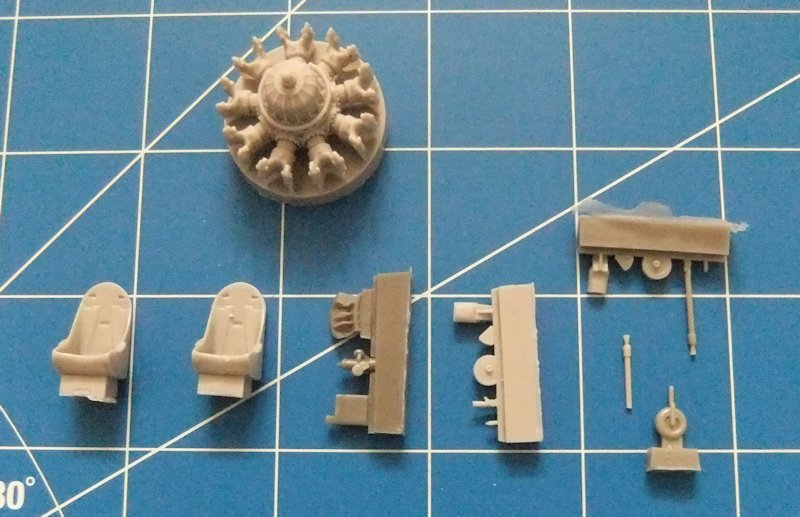 Bausatz: Die Short-Run-Wiederauflage besteht aus Plastik-, Resin- und Messingteilen. Ansonsten ist aber alles wie gehabt. Der Spritzguss gehört zur oberen Mittelklasse, was sich bei ähnlichen Bausätzen schon beim Zusammenbau bemerkbar gemacht hat. Die Resinteile sind hervorragenden. Dazu gehören unter anderem auch die beiden Pilotensitze und vor allem der schöne Sternmotor. Die Messingteile beziehen sich hauptsächlich auf das Armaturenbrett und die Gurte im Cockpit.