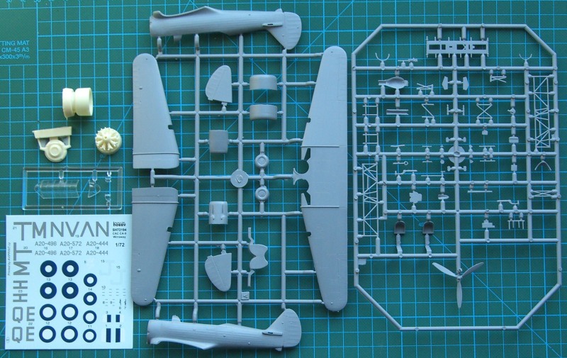 Bausatz: Vor mehr als zehn Jahren gab es schon mal einen Bausatz der Wirraway von MPM/Special Hobby. Hier gibt es nun einen neuen Bausatz dieser australischen Konstruktion. In der attraktiven Schüttbox befinden sich gut verpackt zwei Rahmen mit 63 Spritzgussteilen, drei Resin-, vier Klarsichteile und ein großer Decalbogen. Ein paar Bauteile sind für die Restekiste gedacht. Die Spritzgussteile besitzen gute realistische Strukturen.