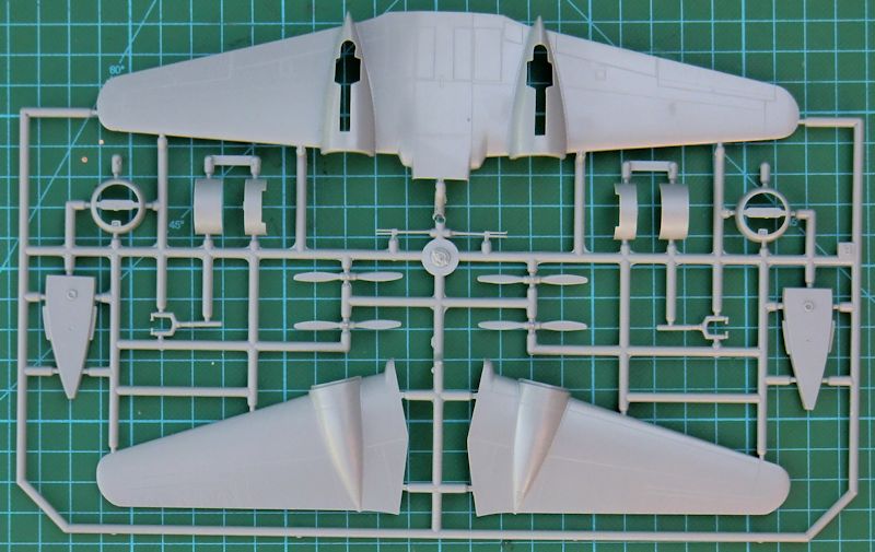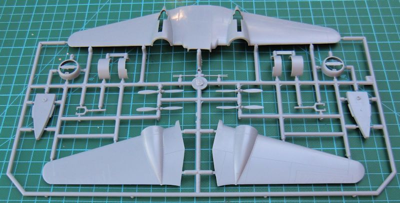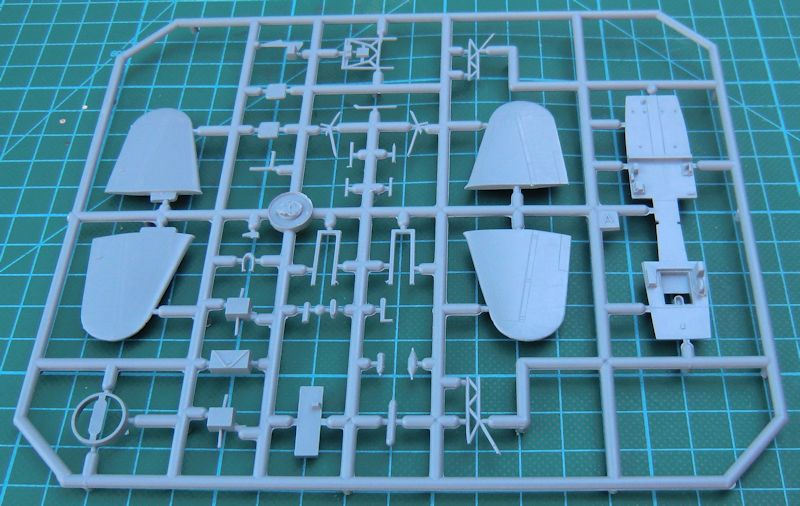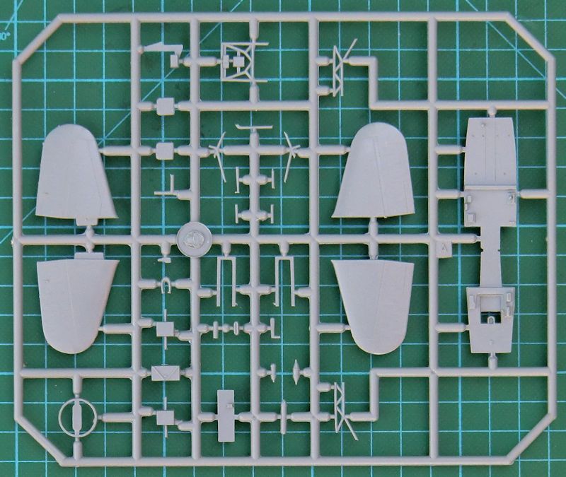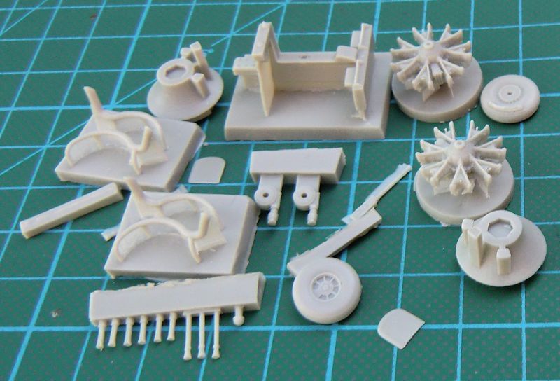 Das Hauptfahrwerk ist realistisch kompliziert wiedergegeben. Die Schutzbleche sind aus Metall und die Räder aus Resin. Ein paar Kleinteile verfeinern das schöne Modell. Bei den Luftschrauben gibt es zwei Varianten. Leider erfährt der Modellbauer nicht welche wohin gehörten.