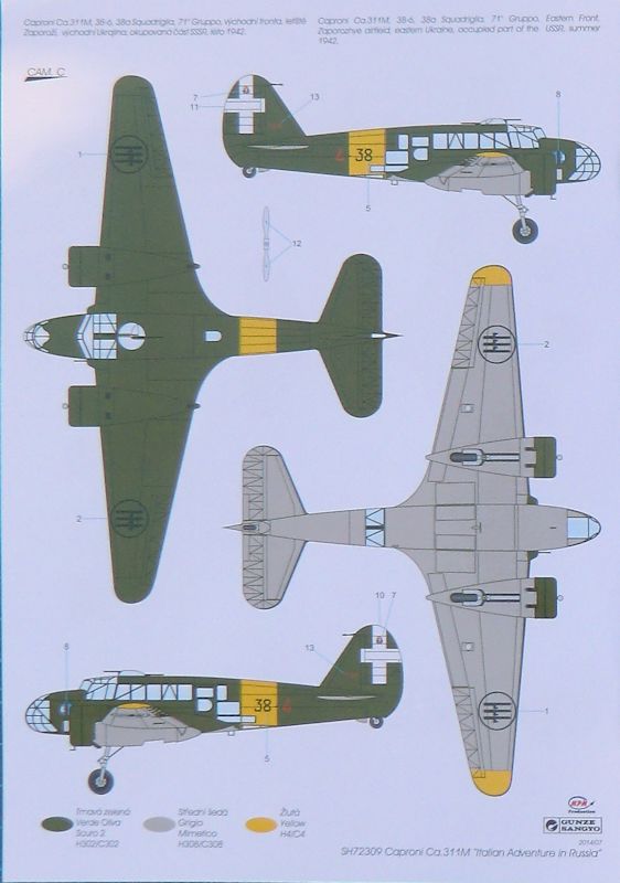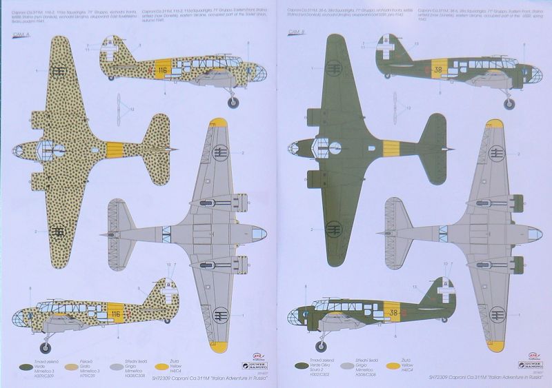 Bausatz: Nach der Caproni Ca. 310-Reihe folgte aktuell die Ca. 311 und Ca. 311M aus der MPM-Gruppe im Label special hobby. Ich war sehr positiv überrascht als ich den praktischen Stülpkarton öffnete. Darin befinden sich gut verpackt zwei hellgraue Spritzlinge mit 51 Teilen, sieben Klarsichtteile, 24 Resinteile, ein schwarzer Maskenbogen, ein Fotofilm, ein Fotoätzteilbogen, ein Decalbogen und die mehrfarbige Bemalungsanleitung. Letzte ist wirklich ein Höhepunkt. Durch die Farben wird es sehr übersichtlich und verständlich. Vielleicht sind die Vier-Seiten-Risse etwas klein aber dafür eindeutig. Weiterhin gibt es einen Plan für das Maskieren der Klarsichtteile. Immerhin sind die Rumpfhälften aus Klarsichtmaterial. Es erspart viel Arbeit.