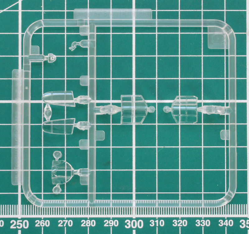 Für die Hauptfahrwerksräder gibt es die Radkappen einzeln. Unterm Rumpf können zwei verschiedene Tanks oder eine Bombe befestigt werden. Ein Visier aus Klarsichtmaterial kann auf die Abdeckung des Instrumentenbretts geklebt werden. Das Cockpit kann mittels Haube verschlossen werden oder sie bleibt offen.