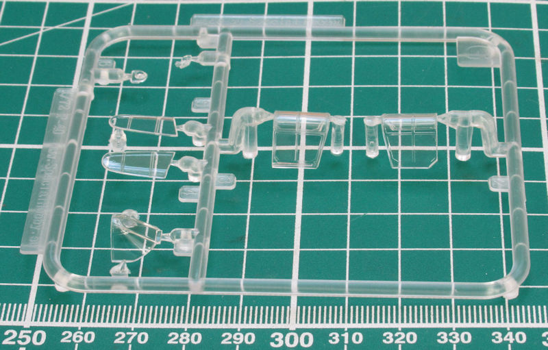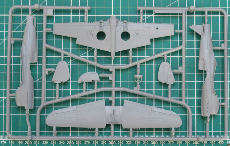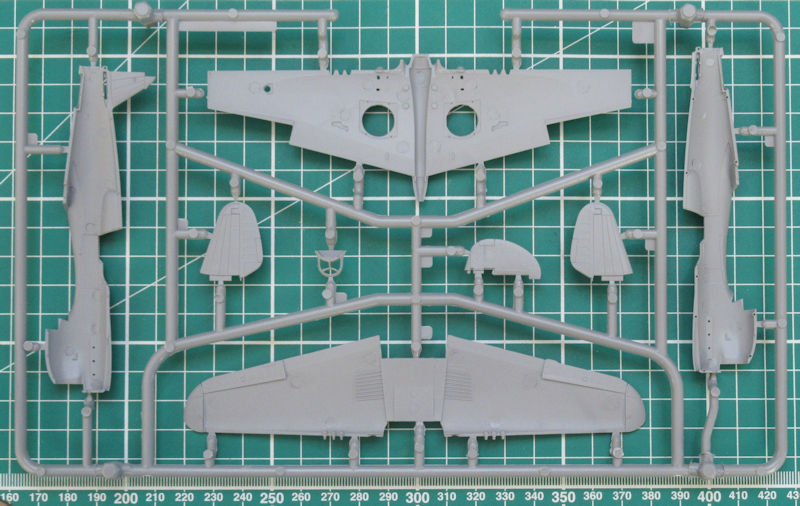 Bei diesem Bausatz tragen die Spritzgussrahmen unterschiedliche Handschriften. Es gibt feine versenkte Strukturen bei den Großbauteilen und die Kleinteile sehen sehr gut aus. Die Seitenkonsolen im Cockpit sind für ein geschlossenes Cockpit durchaus in Ordnung. Das Instrumentenbrett hat ein paar Strukturen und wird mit einem Decal versehen. Der Sitz sollte mit ein paar Gurten versehen werden oder man greift zum CMK-Teil. Der Boden des Cockpits bildet eine Einheit mit der Tragflächenoberseite.
