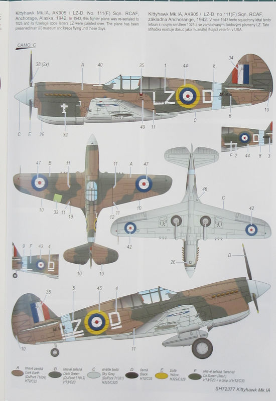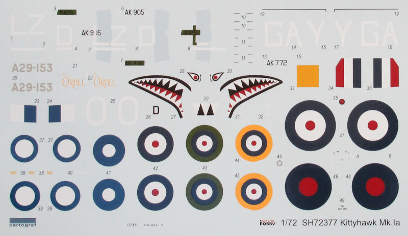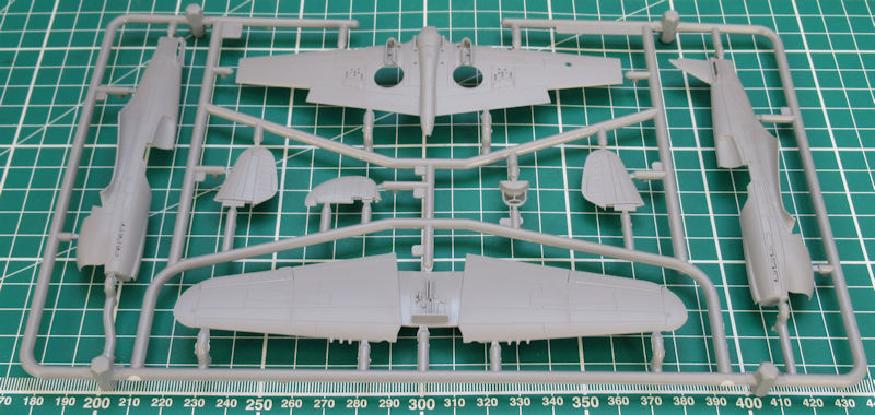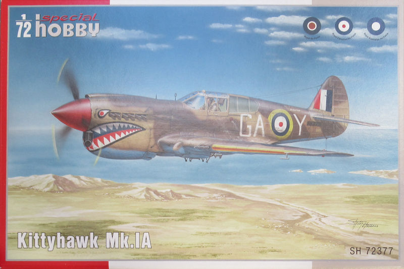 Bausatz: Die Curtiss Kittyhawk Mk. IA im Maßstab 1/72 ist ein neuer gut gemachter Bausatz von special hobby aus Tschechien. In dem attraktiven praktischen Stülpkarton befinden sich gut verpackt zwei hellgraue Spritzlinge mit 73 Teilen, ein Klarsichtrahmen mit sieben Teilen, ein Decalbogen und die mehrfarbige Bau- und Bemalungsanleitung. Ein paar Teile sind für andere Varianten bestimmt und wandern in die Restekiste.