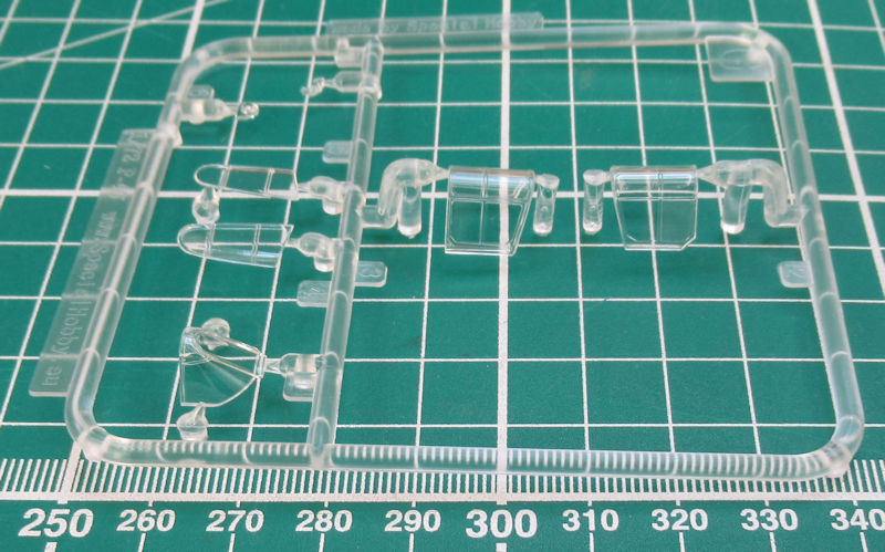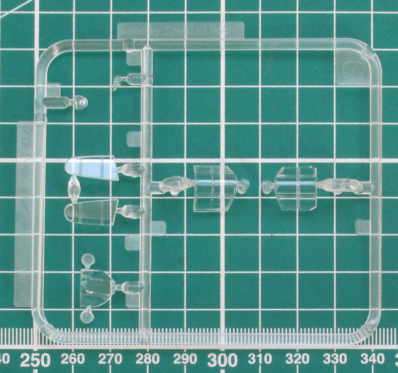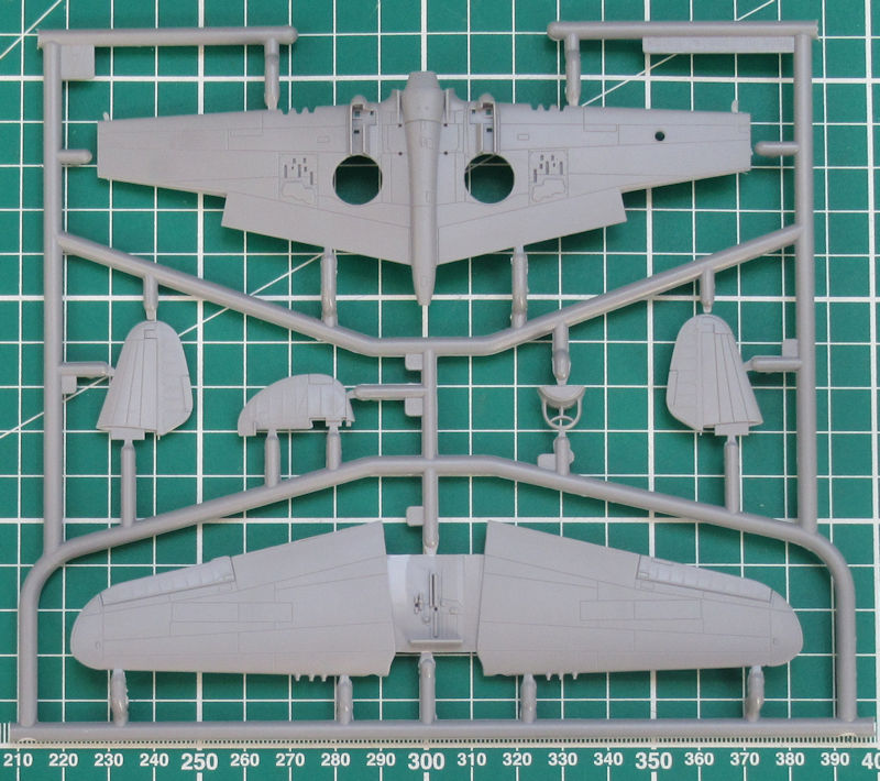 Für die Hauptfahrwerksräder gibt es die Radkappen einzeln. Unterm Rumpf können zwei verschiedene Tanks oder eine Bombe befestigt werden. Ein Visier aus Klarsichtmaterial kann auf die Abdeckung des Instrumentenbretts geklebt werden. Das Cockpit kann mittels Haube verschlossen werden oder bleibt offen.