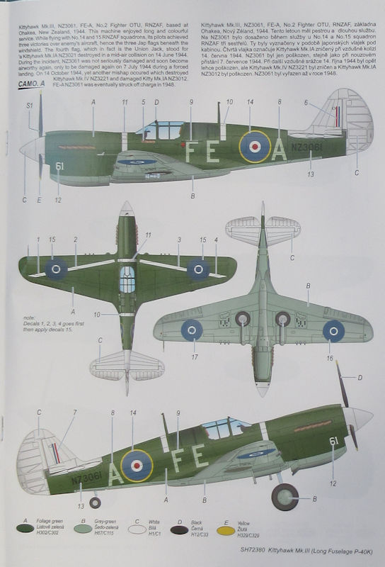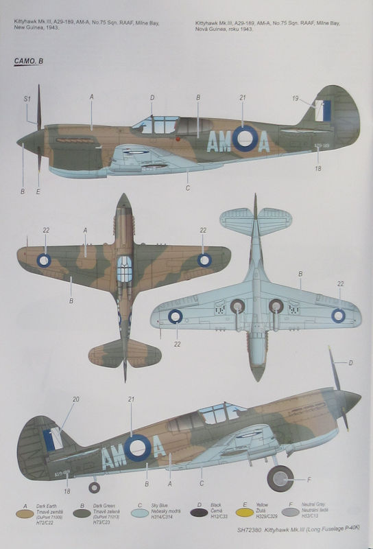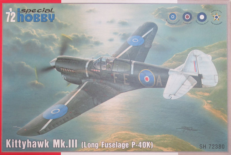 Bausatz: Nach der kurzen Curtiss P-40K von special hobby war es nur eine Frage der Zeit bis auch eine P-40K/Kittyhawk Mk. III mit langem Rumpf erscheint. In dem attraktiven praktischen Stülpkarton befinden sich sehr gut verpackt drei graue Spritzlinge mit 65 Teilen, ein Klarsichtrahmen mit sieben Teilen, ein Decalbogen und die mehrfarbige Bau- und Bemalungsanleitung. Der Spritzling F mit dem neuen beiden Rumpfhälften wurde hier neu erstellt.