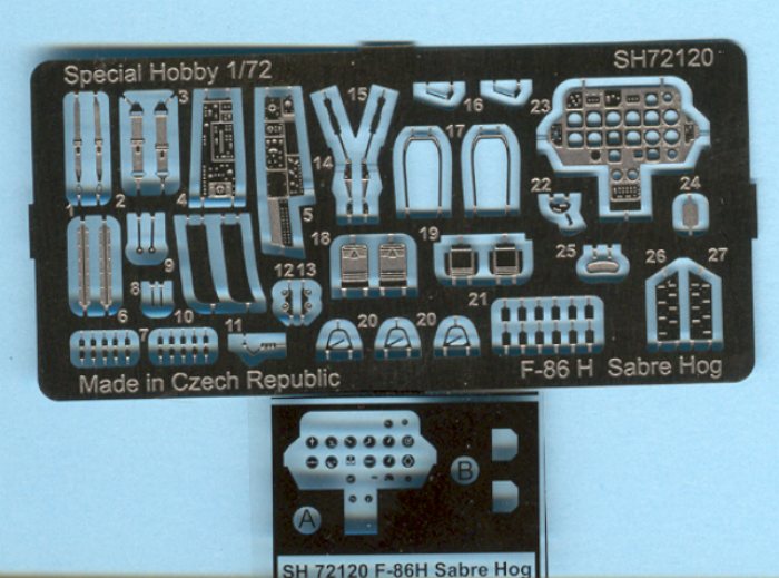 Das Cockpit wird aus einer Spritzgusswanne mit Fotoätzteilen aufgebaut. Dazu gibt es einen Steuerknüppel. Der Schleudersitz wird mit Gurten detailliert. Das Instrumentenbrett ist recht ordentlich. Schon in Bauabschnitt 8 muss sich auf die Version festgelegt werden. Es gibt Alternativteile für die H-1 und H-10 Version. Beim Höhenruder hat der Formenbauer die Vorgaben etwas falsch ausgelegt, denn ansonsten hätte er kein Pendelruder abgeliefert. Ist ja kein Problem, nur beim Ausrichten gilt es ein wenig aufzupassen, damit der Anstellwinkel stimmt. Als Außenlasten gibt es zwei Zusatztanks. Die Decals sind nach den Vorbildern aus o.g. Quelle erstellt worden und hervorragend gedruckt.