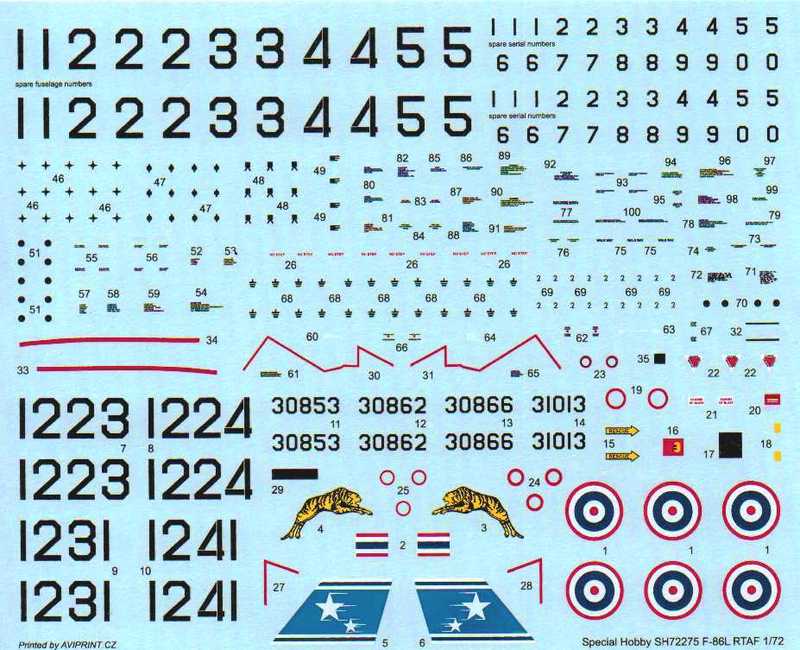 Bemalung Der umfangreiche, sauber gedruckte Decalbogen enthält zahlreiche Wartungshinweise. Er ermöglicht den Bau von vierF-86L der 12th Sqn, 1st Wing der Royal Thai Air Force 1962-67.