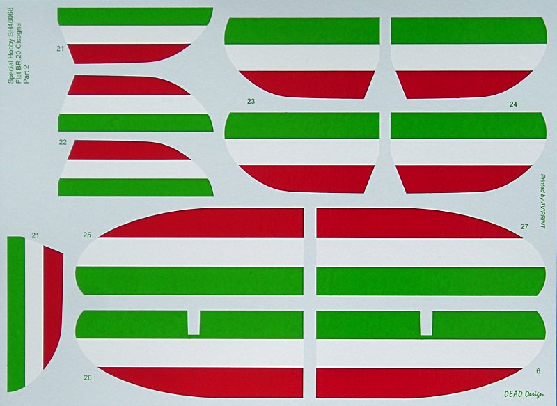Special Hobby bietet 4 Bemalungsvarianten in 3 unterschiedlichen Farbschemen an. Die ersten beiden haben das typische braun-grüne Fleckenschema auf sandgelbem Grund, dann folgt eine Maschine in silber und schließlich eine 3-farb Streifentarnung über grauer Unterseite. Die Decals sind von AviPrint gedruckt und machen einen guten ersten Eindruck.