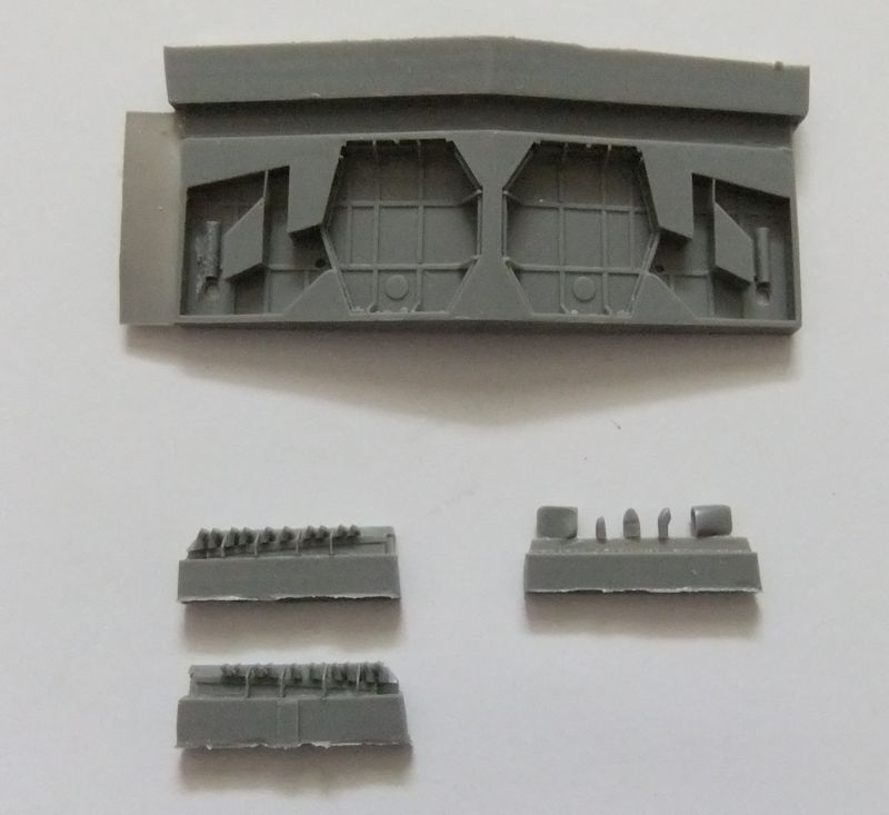 Aus Kunstharz (Resin) sind die Fahrwerksschächte, die Abgasstutzen und einige seitliche Lufthutzen gefertigt. Ob der Winkel des Fahrwerksschachtes mit der V-Stellung der Flügel übereinstimmt, wird sich beim Zusammenbau erweisen. Eine Probepassung ist ratsam. Ansonsten einfach in der Mitte teilen. Einen guten Eindruck macht auch das Fahrwerk.